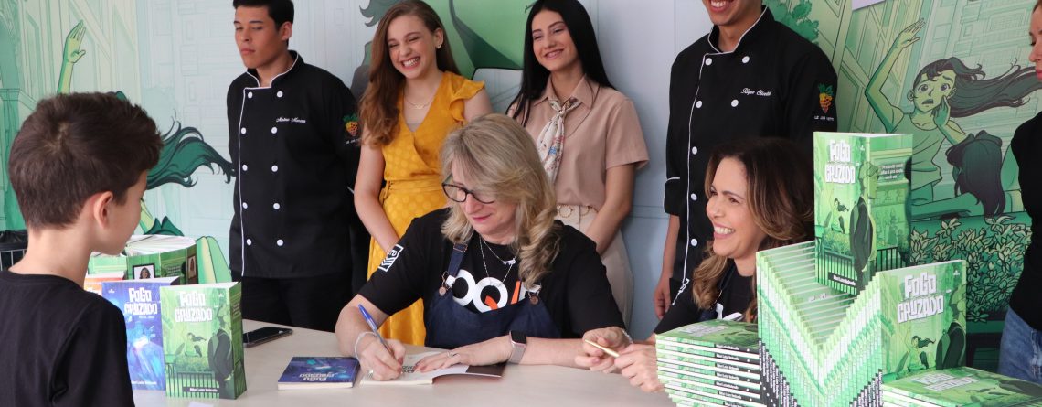 Foram duas manhãs de autógrafos e bate papo com os leitores e milhares de adolescentes puderam conhecer um pouco mais da história de cada personagem e a mensagem do livro através do musical “Fogo Cruzado”.